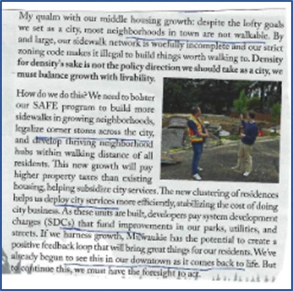 My testimony ("CouncilTest25Je17") is in response to Council President Will Anderson's June Milwaukie Pilot column, which came in the postal mail to Milwaukie residents in this last week. I post photos of Anderson's column on middle housing posted in the next section down.