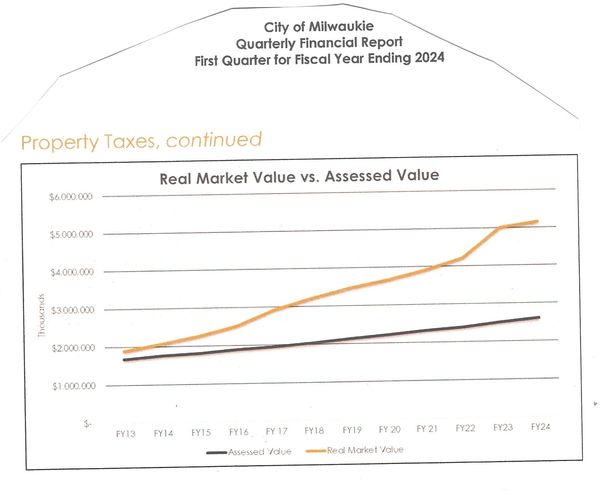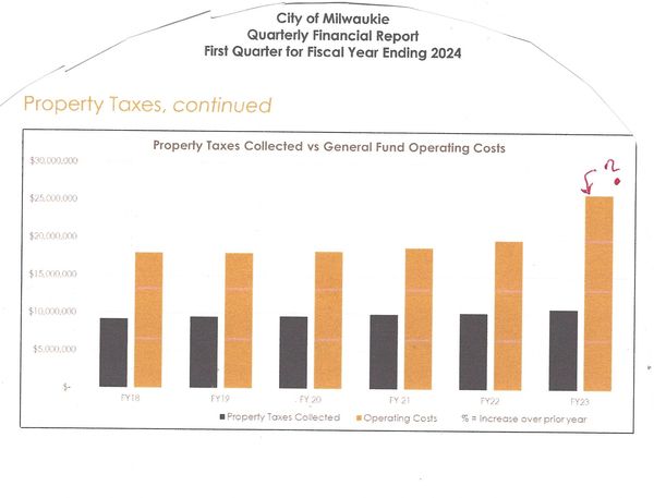 Secondarily, the City Council in the year 2016 under the leadership of then Mayor Gamba approved creating an Urban Renewal District largely for downtown Milwaukie. This Urban Renewal District diverts property taxes into a City slush fund of sorts, thereby reducing the City's property tax collections available for meeting General Fund Operating Costs.