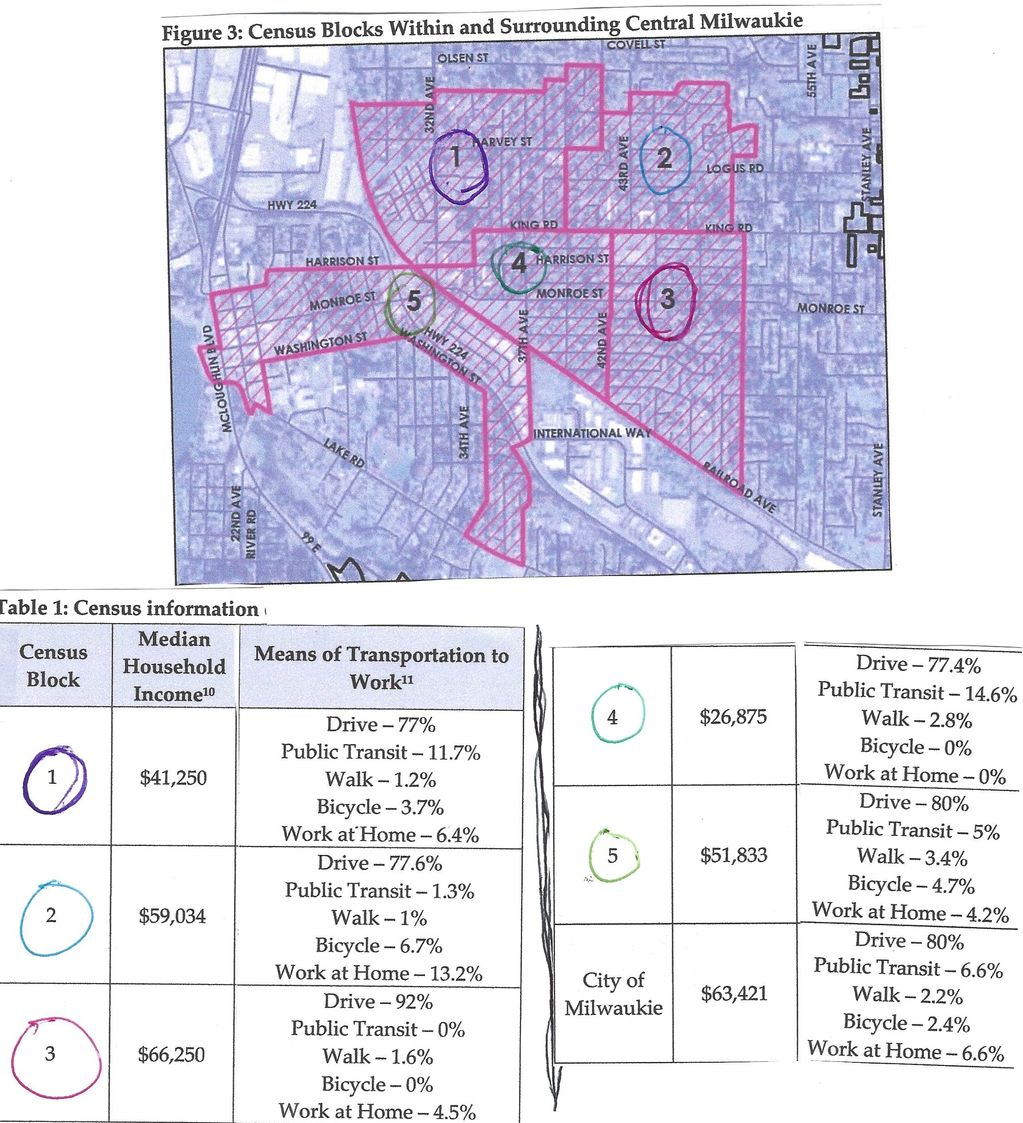 But there needs to be people on this committee who are more representative of the broader community of Milwaukie. Seniors, for instance, for whom bicycling, walking and standing around for a bus; Or having to ride an unsafe Orange Max train; are not really options. Most folks as the data in the table to the left above demonstrates, commute and get around by car.