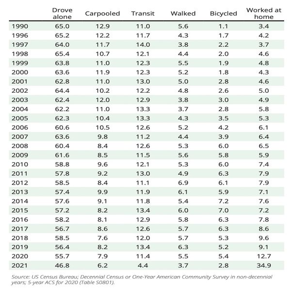 People commuting by car (either alone or in carpool) is still about two thirds of all commuting trips when including working at home (pre Covid-19 data or pre year 2020. If you exclude remote working as a form of commuting, then Auto commuting in the Covid year of 2021 is equal to 80% of all physical commuting trips. (46.8 plus 6.2, this sum divided by (1 minus 34.9%).)