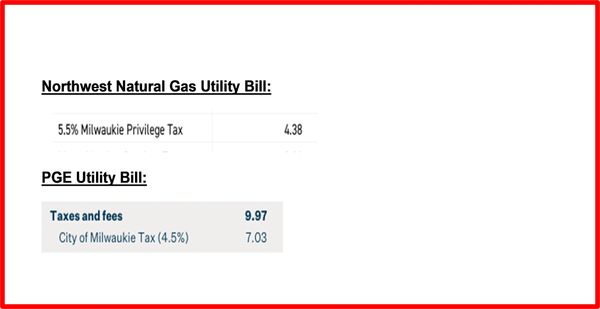 The City of Milwaukie before last summer charged a right-of-way tax for Northwest Natural Gas and PGE electric utility bills of only 1.5%. But in order to fund its "Climate Action Plan," it hiked its right-of-way tax for these utilities to 5.5% in the case of natural gas service and 4.5% for electric utility service. (And so, Milwaukie residents are now paying three times and more for Milwaukie's tax on their utility bills, because of Milwaukie's Climate goal.)
