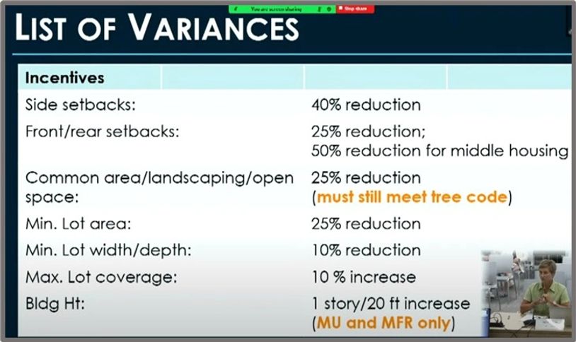 Under the city codes adopted this last Tuesday (8/19/25, excerpt screen shot just above here), developers can cram more housing units onto a lot when the housing is restricted to those with low income, either in ownership or rental. This low-income deed/rental restriction on these properties with little setbacks (open space between housing units) is for a term of 60 years. Cow-a-bunga, that's a long, long time for the City to continually check up on these type housing units to make sure they are actually owned or rented by those with low-income.