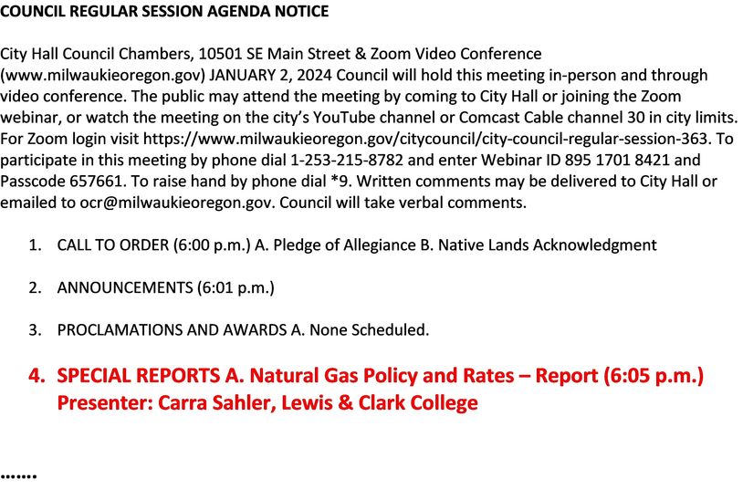 After I tell City Council back on December 19, 2023, that they are potentially causing much higher energy bills for the residents of Milwaukie by denying natural gas utility service, now Council is having some speaker come in from Lewis and Clark College to talk about natural gas policy and rates - this Tuesday evening. I intend to listen to this next week and report back what I hear. Stay informed. It could cost you if you don't and don't speak up.