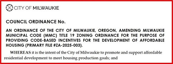 The printed block outlined in red, above, is an ordinance that Milwaukie City Council is likely to pass this coming Tuesday, August 19, 2025. It makes it easier for Milwaukie City Hall to fund, with taxpayer monies, more "affordable" housing shacks like the one pictured in the panel just to the right of this panel.
