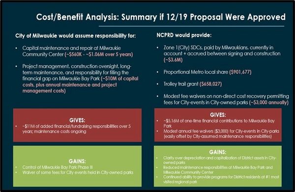 Milwaukie's grand plan for improving Milwaukie Bay Park (which is just across Milwaukie's downtown on the Willamette River) is expected to cost upwards of $10 million. Milwaukie's current proposal for taking over Milwaukie Bay Park from NCPRD asks that Milwaukie receive NCPRD System Development Charges (SDC) that are associated with development revenues located in the City of Milwaukie. These SDC monies if granted to Milwaukie, would provide some $3.6 million towards Milwaukie Bay's development costs. This and other funding sources are thought to leave Milwaukie with having to come up with $5 million in new taxpayer or other monies to develop Milwaukie Bay Park.