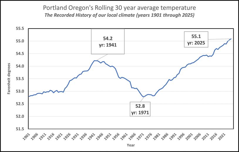 The around the clock Portland Airport temperature registers just about 55.1 degrees Fahrenheit for the last thirty years, a tad higher than the 30-year average posted at the end of year 2023. So, the Portland area climate as measured by average temperature for 30 years continues to increase.
