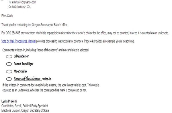 I wrote the Oregon Secretary of State (e-mail just above) asking what would happen if a majority of voters wrote in for a particular election - such as in a case where a Judge runs for re-election unopposed - the words "None of the Above."