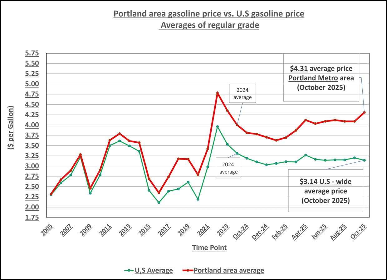 Locally, here in Milwaukie, cash regular gasoline starts the month of October at $3.999 per gallon at the FasTrak at Linwood & King Roads. The Space Age gasoline station at 42nd and Harrison is priced at $4.079. (Milwaukie's Space Age gasoline price peaked last month (September 2025) at about $4.30 per gallon. Ouch!)
