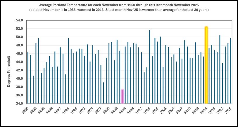 November 2025 in the Portland area, as measured by the National Weather Service at its benchmark Portland Airport temperature gauge, is 2.6 degrees (F) warmer than the last 30-year average, registering an average of 49.7 for the month versus 47.1 for the last 30 Novembers.