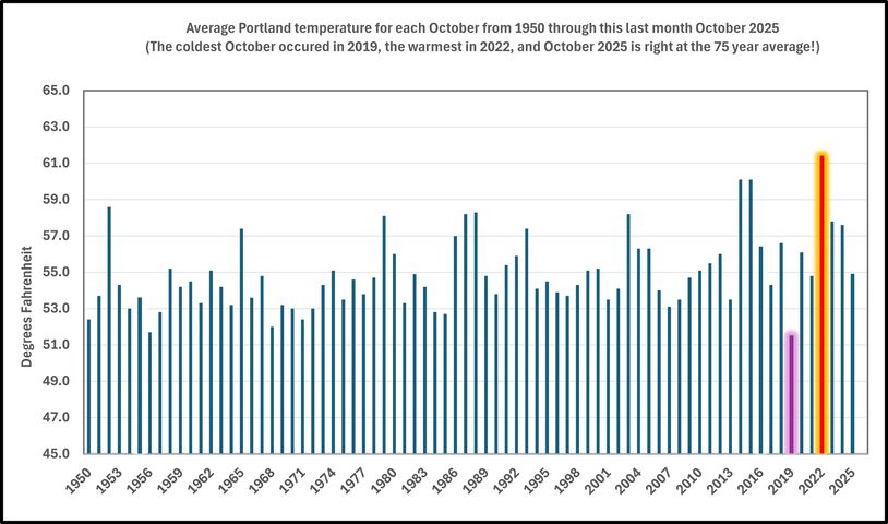The coolest October in Portland occurs only 6 years ago in 2019, and the warmest is only four years ago in 2022.